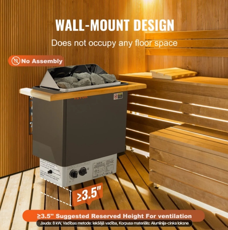 Sienas stiprinājuma konstrukcija: Izbaudiet ērtu uzstādīšanu ar mūsu tvaika pirts sildītāju, kam ir iepriekš urbts kronšteins ar rezervētām spriegošanas skrūvēm. Vienkārši nostipriniet sildītāju, izmantojot šo darbietilpīgo sistēmu. Lai nodrošinātu optimālu siltuma izkliedi un uzlabotu drošību, iesakām uzstādīt sildītāju 3,5 collu augstumā no grīdas. Tas ne tikai nodrošina drošu lietošanu, bet arī palīdz ietaupīt vērtīgu grīdas platību.