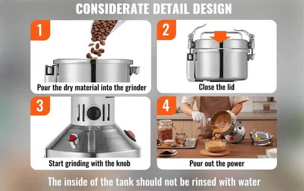Izturīgs materiāls: Elektriskā mazā garšvielu dzirnaviņa ir izgatavota no pārtikas kvalitātes nerūsējošā tērauda, kas ir izturīgs un nerada piesārņojumu apstrādes laikā. Sprādzes konstrukcijai ir labs blīvējums un augsta drošības spēja. Ja neesat apmierināts ar malšanas efektu, varat izsijāt rupjās daļiņas un vēlreiz samalt, lai iegūtu smalkākus rezultātus.