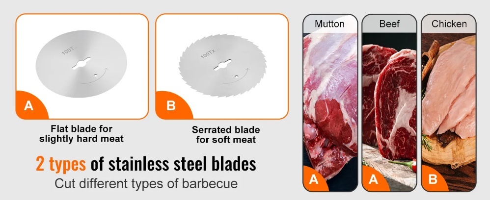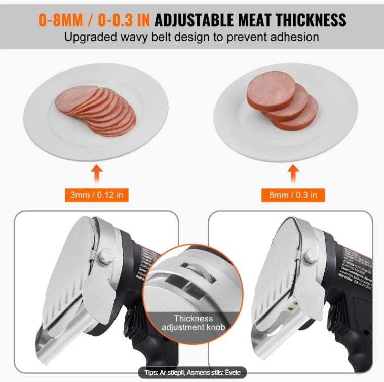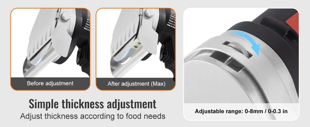 Regulējams biezums: Komerciālajam žiroskopiskajam griezējam augšpusē ir biezuma regulēšanas poga ar diapazonu no 0 līdz 8 mm / 0 līdz 0,3 collām. Jūs varat pielāgot izmēru pēc nepieciešamības, sagriežot bārbekjū līdz perfektai tekstūrai.