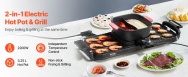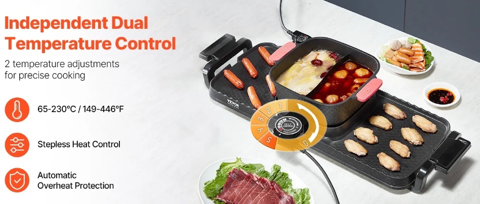 Neatkarīga temperatūras kontrole: Mūsu karsto katlu grila kombinācija ir aprīkota ar divām pogām bezpakāpju siltuma kontrolei. Tā neatkarīgi regulē siltumu abām zonām, nodrošinot jums pilnīgu kontroli pār gatavošanu bez traucējumiem. Vienkārša darbība optimāliem rezultātiem.