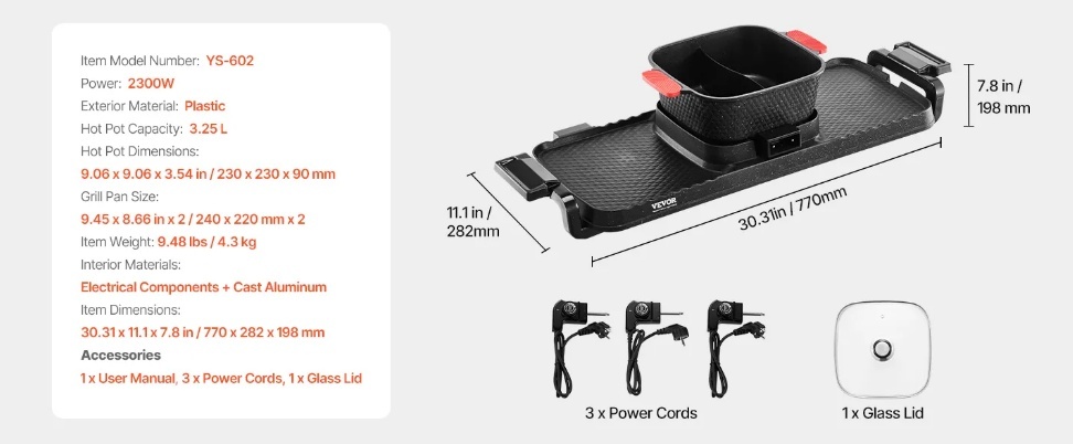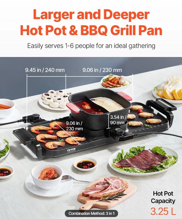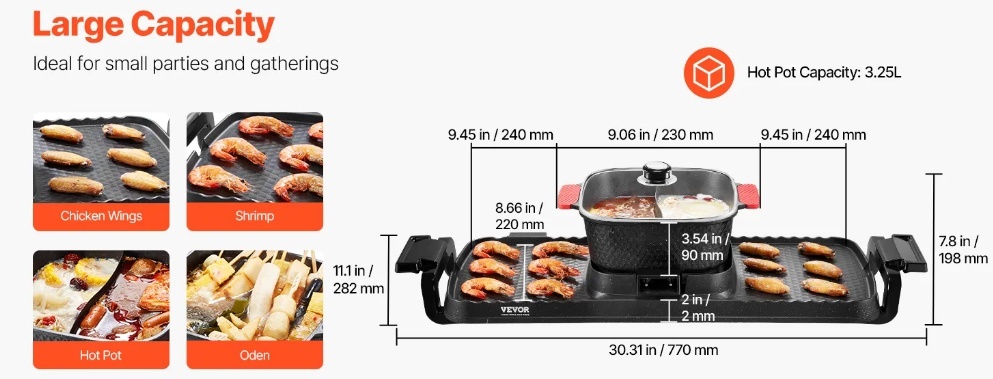 Liela ietilpība: Ar noņemamu 9,06 x 9,06 x 3,54 collu (230 x 230 x 90 mm) karsto katlu un divām 9,45 x 8,66 collu (240 x 220 mm) grila pannām, mūsu 3,25 litru karstais katls un grils viegli apkalpo 1–6 cilvēkus jautrai un sātīgai kopā būšanai.