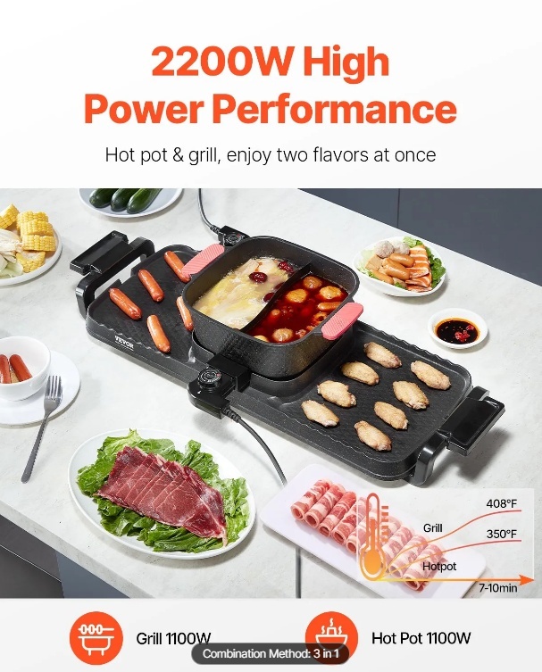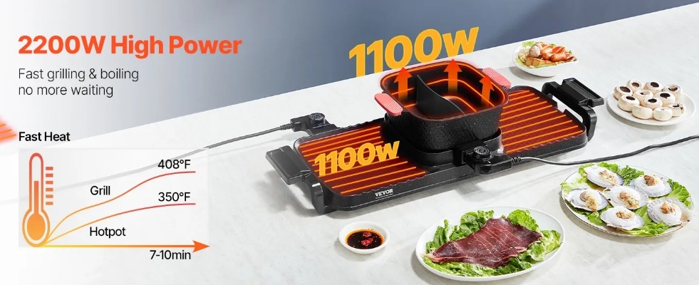 VEVOR karstais katls ar grilu, 2300 W 2-in-1 elektriskais bezdūmu grils un karstais katls