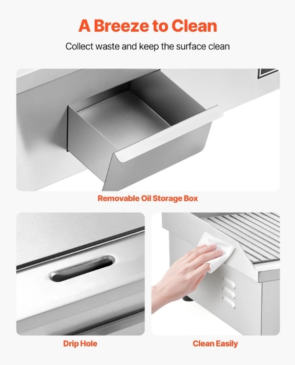 Viegli tīrāms: Palielināta pilienu atvere un noņemama eļļas paplāte savāc atkritumus ātrai tīrīšanai. Mūsu komerciālajam pusplakanajam grilam ir iekļautas otas un lāpstiņas papildu ērtībai.