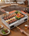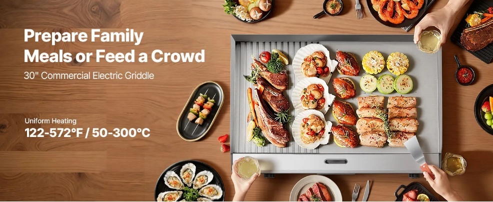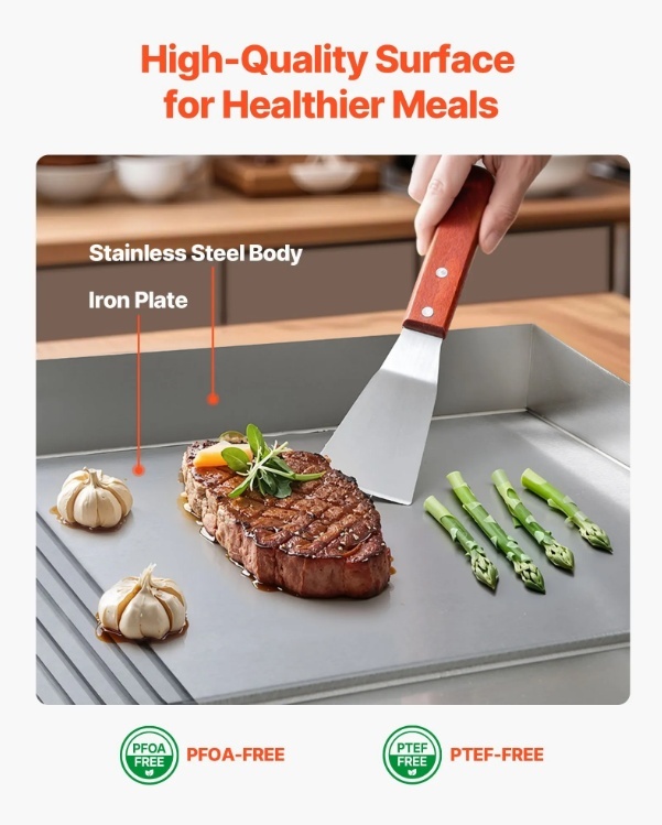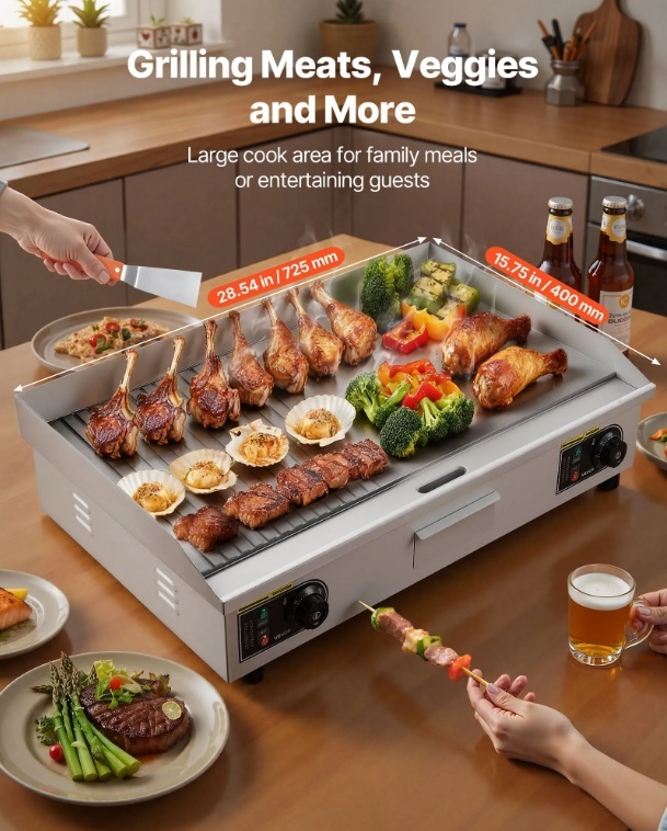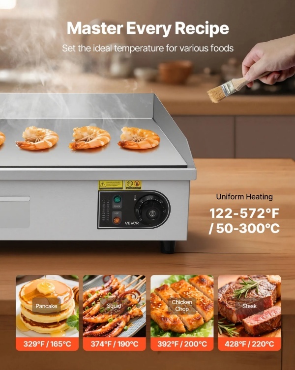 Dažādiem ēdieniem un gadījumiem: Šis komerciālais grils ir ideāli piemērots lietošanai mājās vai komerciāli, piemēram, restorānos, veikalos un pārtikas stendos. Tas ir piemērots pankūkām, bekonam, sieram, omletēm, picai, steikam un burgeriem.