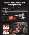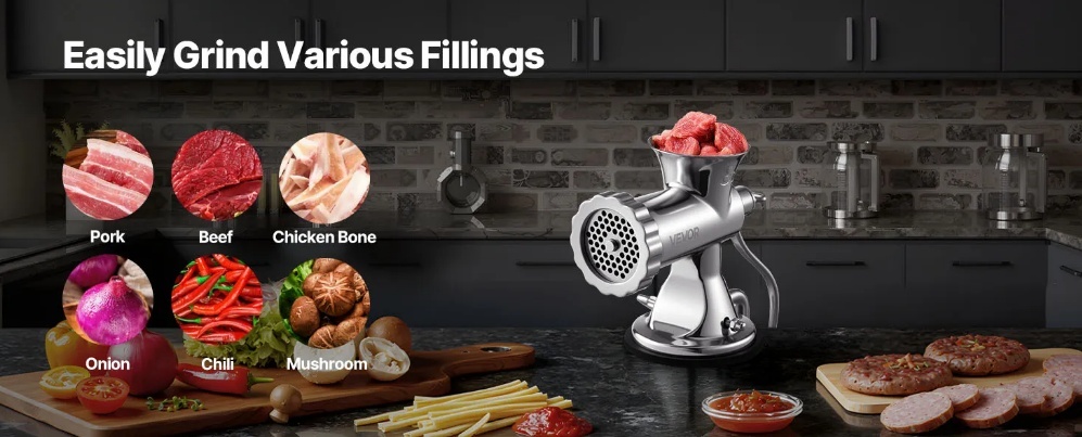 VEVOR manuālā gaļas maļamā mašīna ir pietiekami daudzpusīga, lai apstrādātu dažāda veida gaļu, tostarp cietu un neparastu tekstūru gaļu, padarot to par noderīgu instrumentu gan kulinārijas, gan rokdarbu vajadzībām. Neatkarīgi no tā, vai maļat liellopu gaļu, cūkgaļu vai pat vārītu tītara skrimšļus, šī mašīna tiks galā ar visu! Tās izturīgā konstrukcija nodrošina, ka tā var tikt galā ar cietiem materiāliem bez bojājumiem. Šī daudzpusība padara to par vērtīgu papildinājumu jebkurai virtuvei vai darbnīcai, ļaujot jums uzticēties šai gaļas maļamajai mašīnai ar desu gatavotāju visām jūsu malšanas vajadzībām, tostarp pārtikas un nepārtikas precēm.