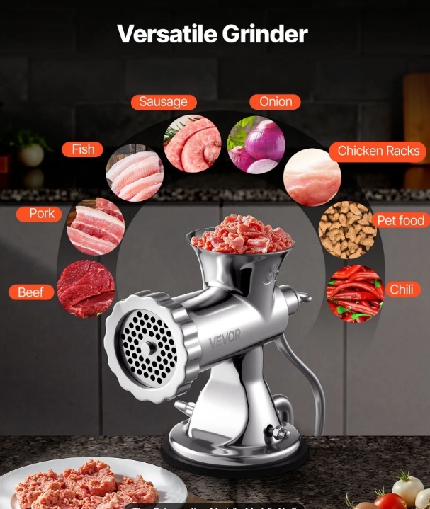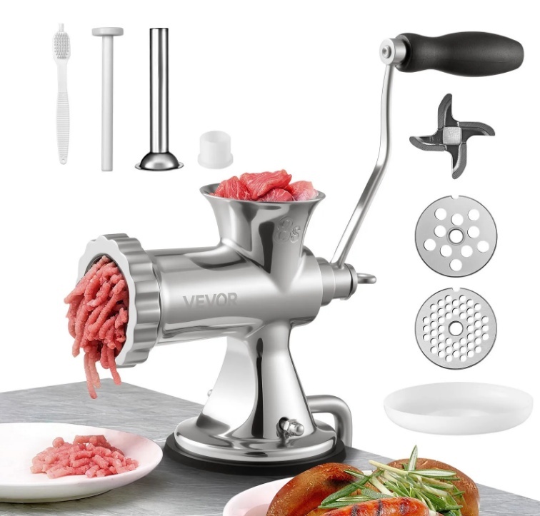 VEVOR manuālā gaļas maļamā mašīna ir ideāli piemērota mājās gatavotu desu un burgeru pagatavošanai. Tās dizains ļauj kontrolēt malšanas procesu, garantējot nemainīgus rezultātus katru reizi. Mēs izveidojām šo gaļas mašīnu, lai tā apstrādātu dažādus gaļas veidus, ļaujot jums eksperimentēt ar dažādām receptēm. Neatkarīgi no tā, vai maļat liellopu gaļu, cūkgaļu vai vistu, šī gaļas mašīna piedāvā daudzpusību un uzticamību. Tās manuālā darbība nodrošina, ka jūsu desas tekstūra ir tieši tāda, kādu vēlaties saviem hamburgeriem un sviestmaizēm. Ar šo mašīnu jūs varat pacelt savas kulinārijas prasmes un baudīt gardas mājās gatavotas maltītes.