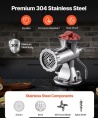 Pārtikas kvalitātes 304 nerūsējošais tērauds: Visas mūsu izturīgās gaļas maļamās mašīnas daļas ir izgatavotas no pārtikas kvalitātes nerūsējošā tērauda viengabala lējuma, kam ir lieliska izturība pret rūsu, koroziju un viegla tīrīšana. Smalkais spoguļpulēšanas process padara korpusu un iekšējās daļas vēl perfektākas. Jums nav jāuztraucas par metāla skaidu atdalīšanos un dārgu sastāvdaļu izšķērdēšanu.