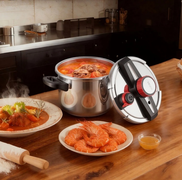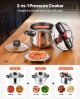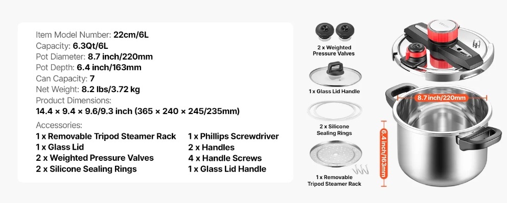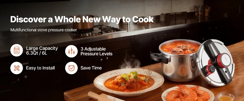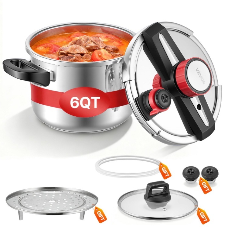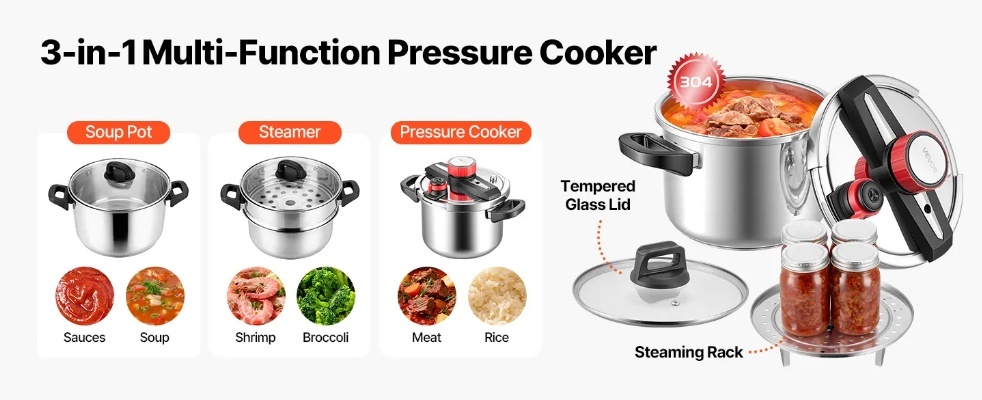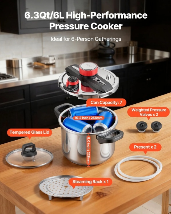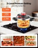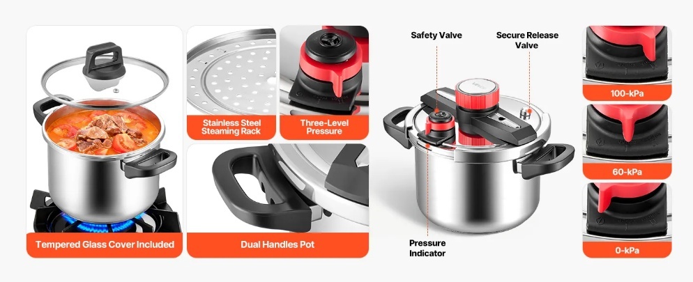 Trīs vienā dizains: Ar 6,3 QT/6 l ietilpību plīts virsmas spiediena katls apvieno zupas katlu, tvaicēšanas režģi un spiediena režīmu. Izvēlieties manuālu atbrīvošanu, 60 kPa vai 100 kPa spiedienu atbilstoši savam ēdienam, nodrošinot ātru un vienmērīgu gatavošanu, kas palīdz saglabāt dabisko garšu un galvenās uzturvielas zem augsta spiediena.