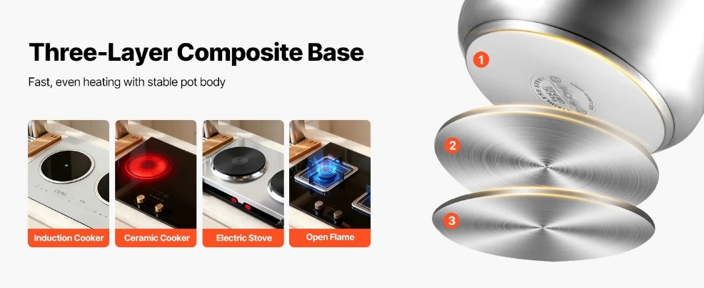 Vienmērīgas siltuma struktūra: trīsslāņu dibens ļauj spiediena katlam ātri un vienmērīgi uzkarst uz indukcijas, keramikas, elektriskām vai gāzes plītīm. Tas bez ierobežojumiem ir piemērots dažādām gatavošanas konfigurācijām un nodrošina enerģijas ietaupījumu līdz pat 75%, vienlaikus saglabājot ēdienreizes elastīgu un efektīvu.