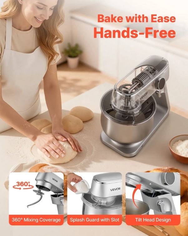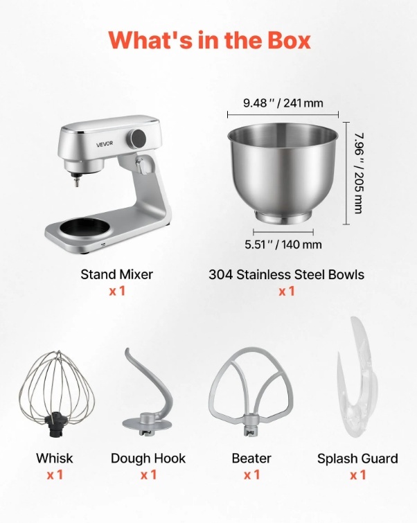 Viegli noņemams un tīrāms: Vienreiz noliecama galviņa automātiski apstājas, kad to paceļ, ļaujot viegli pievienot vai noņemt maisīšanas piederumus. Pagrieziet un paceliet bļodu, lai to noņemtu. Piederumi, tostarp bļoda, āķis un stienis, ir izgatavoti no pārtikas kvalitātes nerūsējošā tērauda un ir droši mazgājami trauku mazgājamā mašīnā.