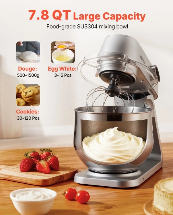 VEVOR stacionārais mikseris, 7,4 l elektriskais virtuves mikseris , 1800 W mīklas maisītājs , 10 ātrumi , noliecama galviņa