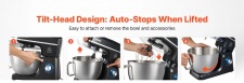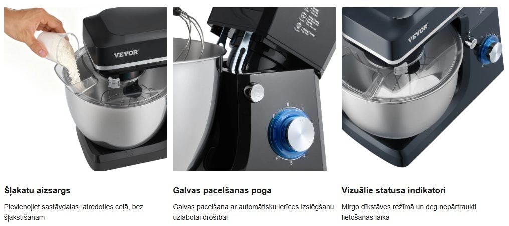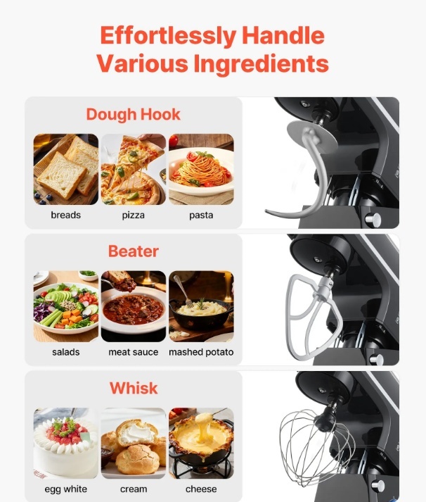 Pilnīgs maisīšanas risinājums: Gatavs jebkuram darbam virtuvē! Mūsu stacionārajam mikserim ir 3 profesionāli maisīšanas piederumi: mīklas āķis picas vai citas smagas mīklas vieglai mīcīšanai, plakanais putotājs kartupeļu biezeņa, kūku mīklas vai glazūras saputošanai un putotājs vieglu maisījumu, piemēram, pūkaina putukrējuma vai olu baltumu, pagatavošanai.