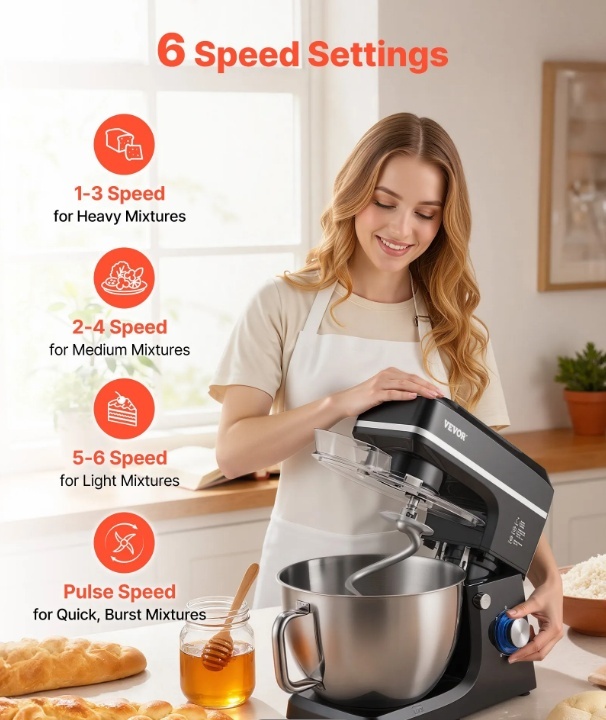 Augstas veiktspējas maisīšana: Mūsu elektriskais pārtikas mikseris ir aprīkots ar jaudīgu motoru un tārpu pārnesumu ātrai un vienmērīgai maisīšanai. Izvēlieties no 6 regulējamiem ātrumiem un pulsa režīma, lai katru reizi iegūtu vēlamo rezultātu. Izmantojiet ātrumus 1–3 mīklai, 2–4 pildījumiem un 5–6 putukrējumam. Piezīme: Pirms ātruma maiņas vienmēr apturiet ierīci.