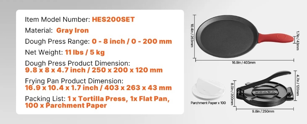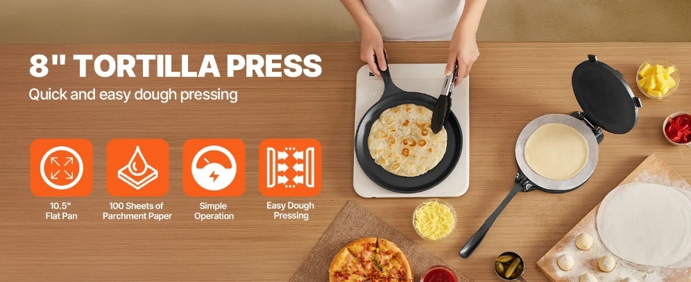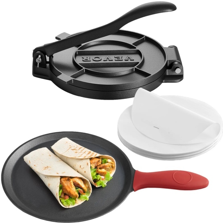 VEVOR tortilju prese , 8 collu čuguna tortilju un roti veidotājs , izturīga tortilju prese , patakoneru veidotāji ar rokturi un 100 gab. cepampapīra