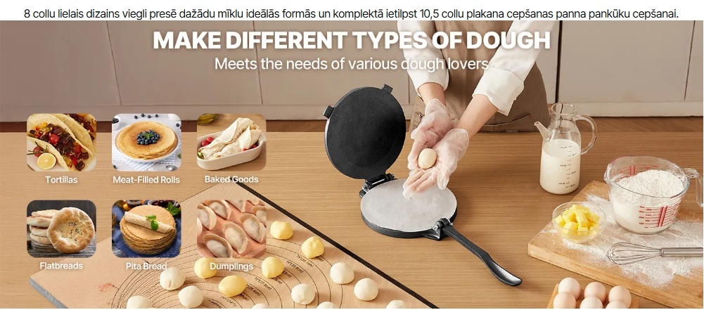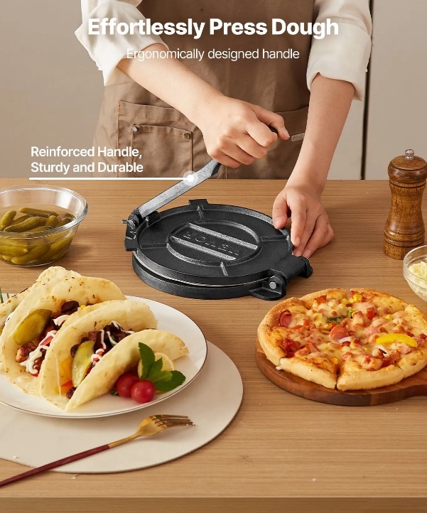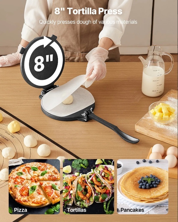 8 collu liela izmēra mīklas prese: šai tortilju presei ir 8 collu liela izmēra dizains, kas ļauj viegli presēt dažādu mīklu patīkamās formās, piemēram, tortiljās, plācenīšos, ar gaļu pildītās rullīšos, pitas maizē, ceptos izstrādājumos, pelmeņos un citur. Tā ir ideāli piemērota lietošanai mājās.