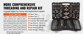 Viss vienā vītņurbju un vītņgriezņu komplekts: Šajā vītņurbju vītņu komplektā ietilpst 35 gab. konusveida vītņgriezi, 35 gab. aizbāžņa vītņgriezi, 35 gab. vītņgriezieni, 2 gab. vītņgriezēju atslēgas, 2 gab. vītņgriezēju atslēgas un 1 gab. T veida vītņgriezēju atslēga. Izmēri: M2x0.4, M3x0.5, M4x0.7, M5x0.8, M6x0.75, M6x1.0, M7x0.5, M7x1.0, M8x0.75, M8x1.0, M8x1.25, M9x0.75, M9x1.0, M9x1.25, M10x0.75, M10x1.0, M10x1.25, M10x1.5, M11x0.75, M11x1.0, M11x1.25, M11x1.5, M12x0.75, M12x1.0, M12x1.25, M12x1.5, M12x1.75, M14x1.0, M14x1.25, M14x1.5, M14x2.0, M16x1.0, M16x1.5, M16x2.0, M18x1.5.