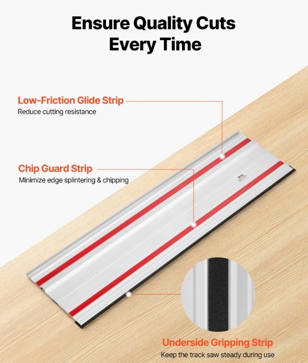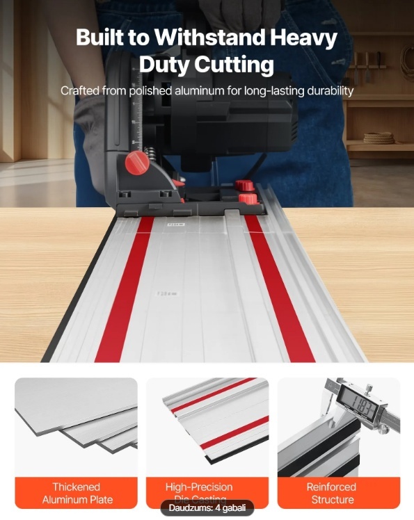 Drošība ir pirmajā vietā: šai zāģa sliedei ir mazas berzes slīdes josla, šķembu aizsargjosla un neslīdoša satvēriena josla stabilai un tīrai darbībai. Izbaudiet vienmērīgu kustību, griezumus bez šķembām un stabilu precizitāti katrā gājienā.
