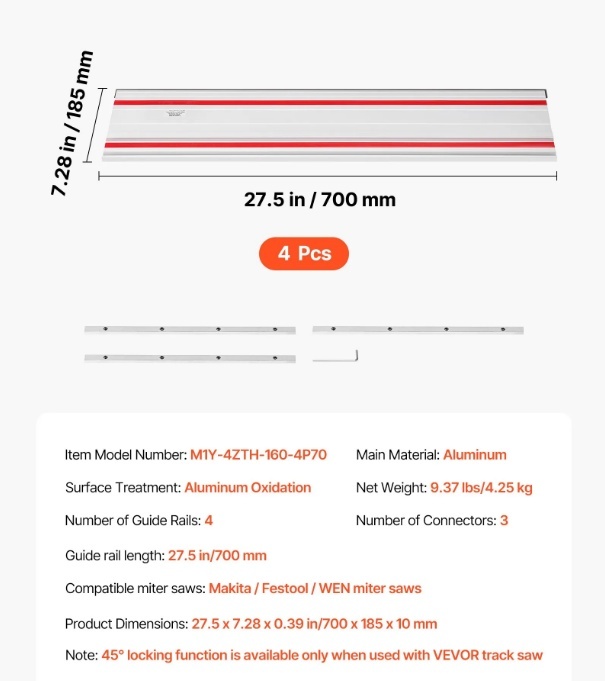 Šajā komplektā ietilpst četras 27,5 collu vadotnes sliedes un trīs savienotāji taisniem, līdzsvarotiem un precīziem griezumiem garās vai sarežģītās sagatavēs. Izgatavots no korozijizturīga alumīnija ar zemas berzes sloksnēm vienmērīgai darbībai. Saderīgs ar Makita, Festool un WEN sliežu zāģiem, lai atvieglotu instrumentu uzlabošanu.