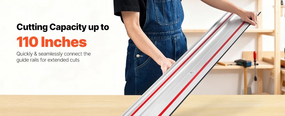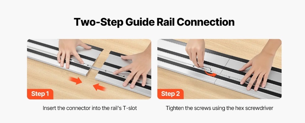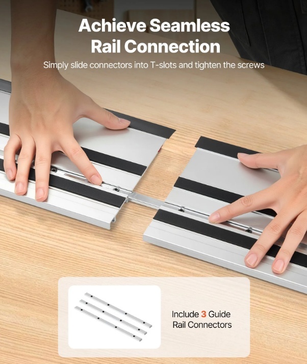 Ātra un nemanāma savienošana: Izmantojiet komplektā iekļauto savienotāju, lai acumirklī pievienotu mūsu sliedes zāģa vadotni, paplašinot sliedes zāģa griešanas jaudu, lai apstrādātu lielākus sagataves gabalus. Nav nepieciešama pastāvīga pārkārtošana vai mērīšana un atzīmēšana.