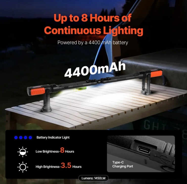 4400 mAh uzlādējams akumulators: Šī darba gaismas josla ir bezvadu un uzlādējama, izmantojot C tipa portu, tādējādi ietaupot papildu akumulatoru un nomaiņu izmaksas. Tā pilnībā uzlādējas 4 stundās un pēc pilnas uzlādes darbojas 3,5 stundas ar augstu jaudu un 8 stundas ar zemu jaudu.