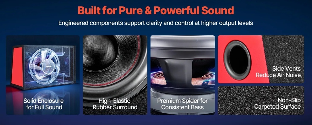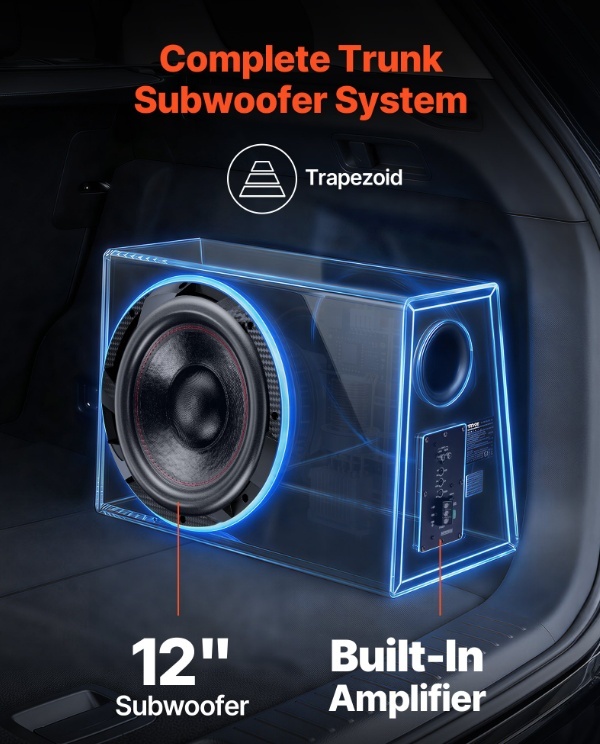 Plāns zemfrekvences skaļruņa basa korpuss: Plānajā trapecveida korpusā ir ievietots 12 collu noslēgts zemfrekvences skaļrunis un iebūvēts pastiprinātājs, kas nodrošina spēcīgu basu, vienlaikus atstājot vairāk vietas bagāžniekam, aprīkojumam vai ikdienas mantām.