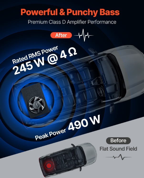 Basa pastiprinājums: Šis zemfrekvences skaļruņa un pastiprinātāja komplekts nodrošina ievērojamu zemfrekvenču pacēlumu un ieskaujošus basus. Zemfrekvences skaļruņa draiveri darbina 245 W RMS, efektīvi aizpildot trūkstošo 30–150 Hz diapazonu, kas raksturīgs rūpnīcas audio sistēmām.