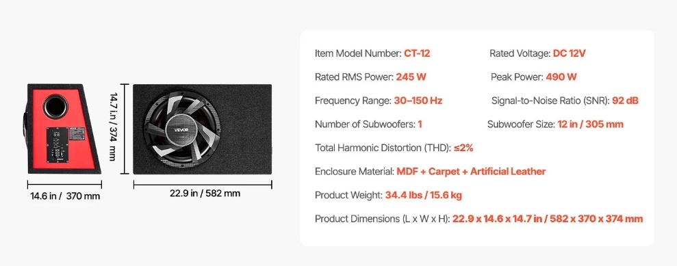 VEVOR zemfrekvences skaļruņa basa komplekts , 305 mm , 245W RMS