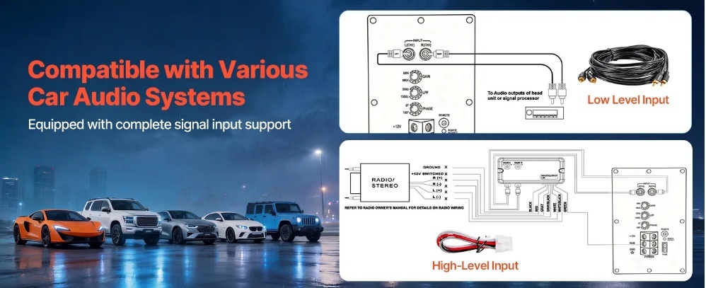 Pastiprinātāja un zemfrekvences skaļruņa kombinācija ir saderīga ar dažādiem transportlīdzekļiem, tostarp sedaniem, apvidus auto un kravas automašīnām. Plaša sprieguma ieeja un komplektā iekļautais augstas un zemas frekvences adapteris atbalsta gan ar RCA aprīkotus galvas blokus, gan pamata rūpnīcas stereosistēmas.