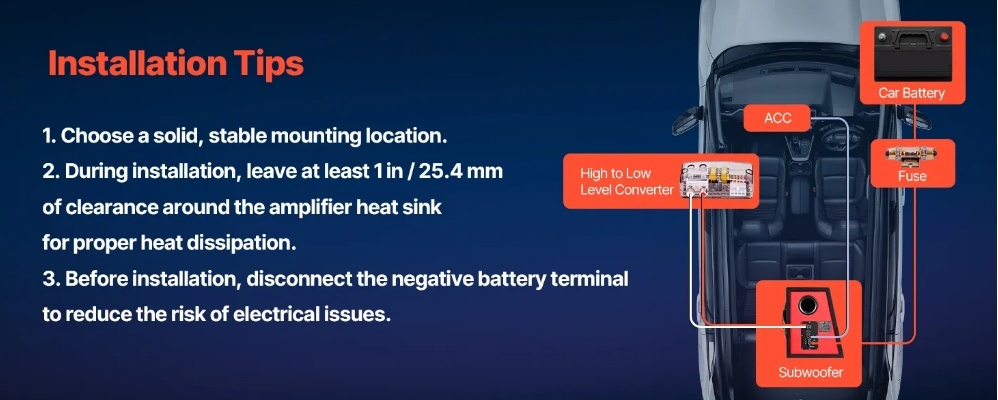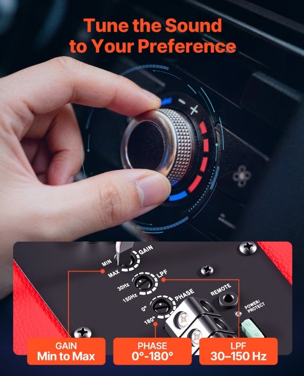 Precīza vadība: Regulējamais vadības panelis uz pastiprinātāja un zemfrekvences skaļruņa kombinācijas ir aprīkots ar GAIN, LPF un PHASE regulatoriem, kas ļauj precīzi noregulēt vēlamo skaņu, lai bass vienmērīgi saplūstu ar rūpnīcas skaļruņiem, nodrošinot līdzsvarotu klausīšanos.