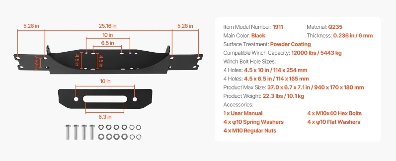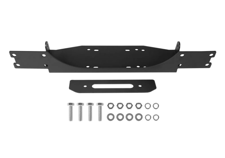 2 vinčas stiprinājuma caurumi: Piekabes vinčas stiprinājums atbalsta 4 caurumu standarta (4,5 x 10 collas) un 4 caurumu standarta (4,5 x 6,5 collas) caurumu konfigurācijas. Daudzpusīgais dizains ir piemērots lielākajai daļai standarta vinču, nodrošinot plašu saderību dažādām lietotāju vajadzībām.