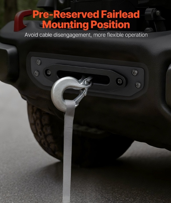 Vadotnes āķa stiprinājums: Vinčas uztvērēja sakabes stiprinājuma iepriekš uzstādītais vadotnes āķa stiprinājums nodrošina vienmērīgu troses vadīšanu, samazinot berzi un nodilumu. Tas ļauj trosi atbrīvot vai ievilkt pa noteiktu trajektoriju, uzlabojot drošību un efektivitāti lietošanas laikā.