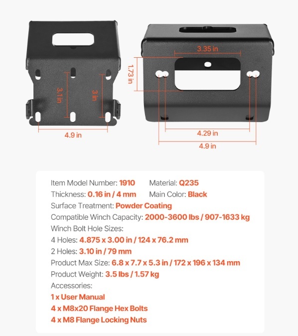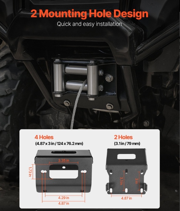 2 vinčas stiprinājuma caurumi: Piekabes vinčas stiprinājums atbalsta 4 caurumu standarta (4,9 x 3,0 collas) un 2 caurumu standarta (3,1 collas) caurumu konfigurācijas. Daudzpusīgais dizains ir piemērots lielākajai daļai standarta vinču, nodrošinot plašu saderību dažādām lietotāju vajadzībām.