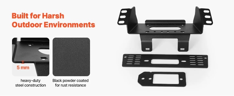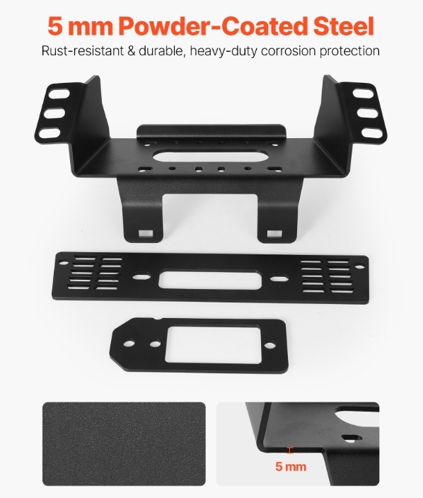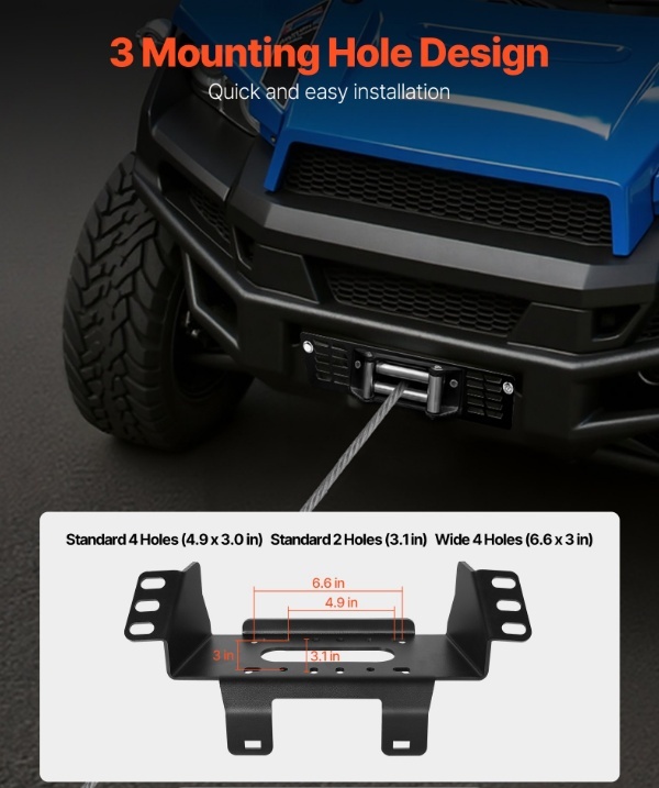3 vinčas stiprinājuma caurumi: Piekabes vinčas stiprinājums atbalsta 4 caurumu standarta (4,9 x 3,0 collas), 2 caurumu standarta (3,1 collas) un platu 4 caurumu (6,6 x 3 collas) caurumu konfigurācijas. Daudzpusīgais dizains ir piemērots lielākajai daļai standarta vinču, nodrošinot plašu saderību dažādām lietotāju vajadzībām.