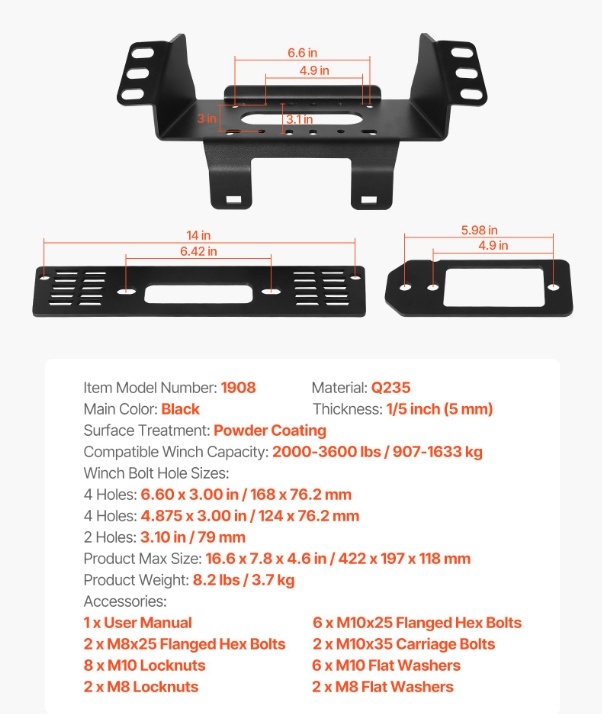 VEVOR vinčas stiprinājums, vinčas celtspēja 907–1633 kg , Polaris Ranger (2010-Present)