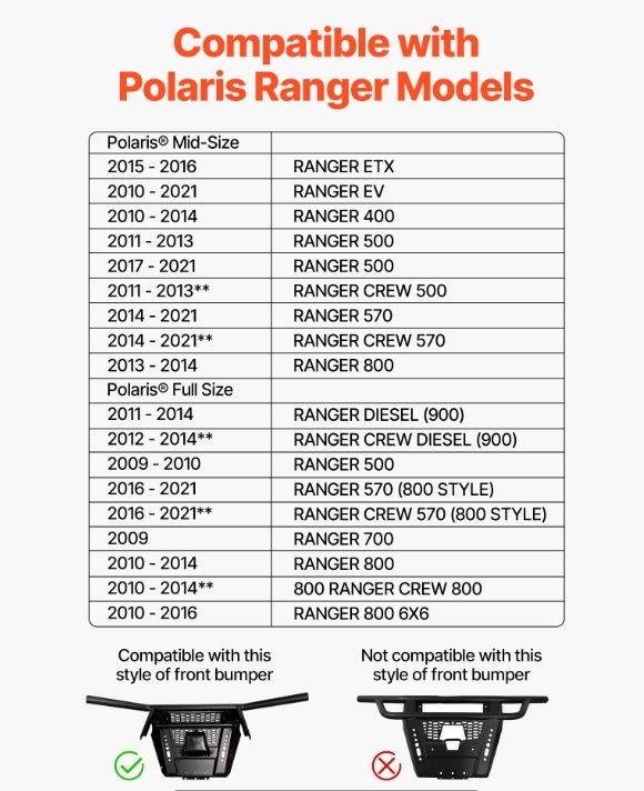 Polaris Ranger modelim specifisks: Mūsu vinčas āķa stiprinājums ir īpaši izstrādāts 2010.–2021. gada Polaris Ranger modeļiem. Tas nodrošina lielisku piemērotību dažādiem modeļiem, tostarp, bet ne tikai, Ranger 570 un Ranger Crew 900, nodrošinot vislabāko uzstādīšanas pieredzi.
