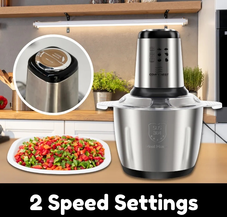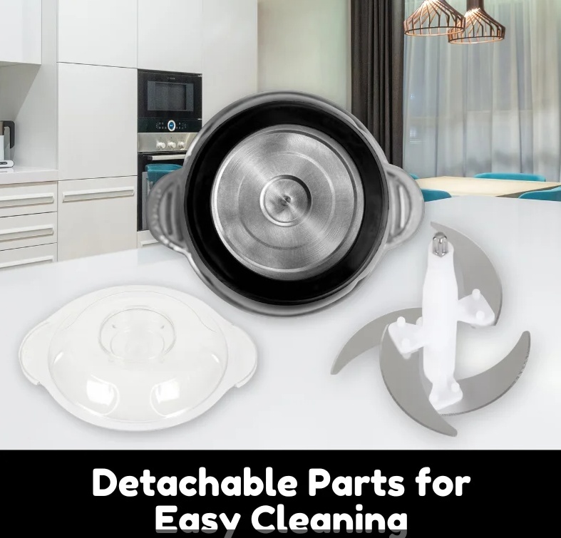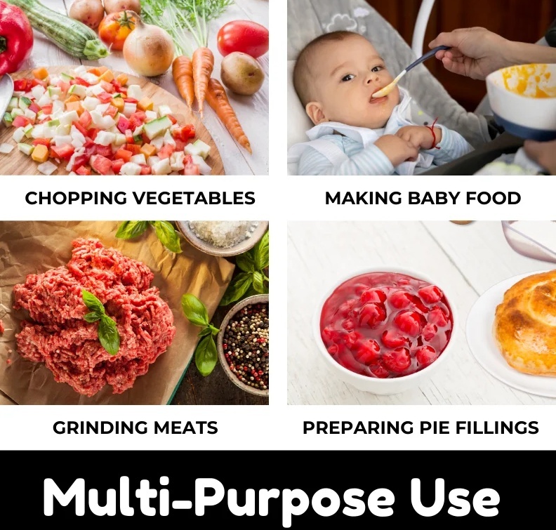 Daudzfunkcionāls lietojums – Šī daudzpusīgā ierīce ir ideāli piemērota dažādiem virtuves darbiem, piemēram, dārzeņu smalcināšanai, gaļas malšanai, bērnu pārtikas pagatavošanai vai pīrāgu pildījumu sagatavošanai. Tā nodrošina elastību plaša recepšu klāsta pagatavošanā.