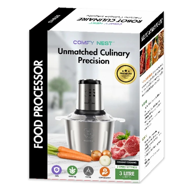 Daudzfunkcionālais virtuves kombains Comfy Nest CN-BLD3 - 3L ir daudzpusīga virtuves ierīce, kas paredzēta ēdiena gatavošanas vienkāršošanai. Ar 3 litru ietilpību un 1000 W jaudu šis virtuves kombains ir lieliski piemērots dārzeņu, augļu, gaļas un citu sastāvdaļu ātrai sasmalcināšanai. Tā lietotājam draudzīgais dizains padara to ideāli piemērotu pildījumu pagatavošanai pelmeņiem, bulciņām, pīrāgiem vai pat augļu salātiem un veselīgam bērnu ēdienam. Ierīce piedāvā elastību, ļaujot lietotājiem kontrolēt sasmalcināto sastāvdaļu lielumu un tekstūru, pamatojoties uz personīgajām vēlmēm, padarot to par būtisku instrumentu mājas pavāriem.