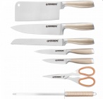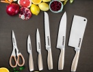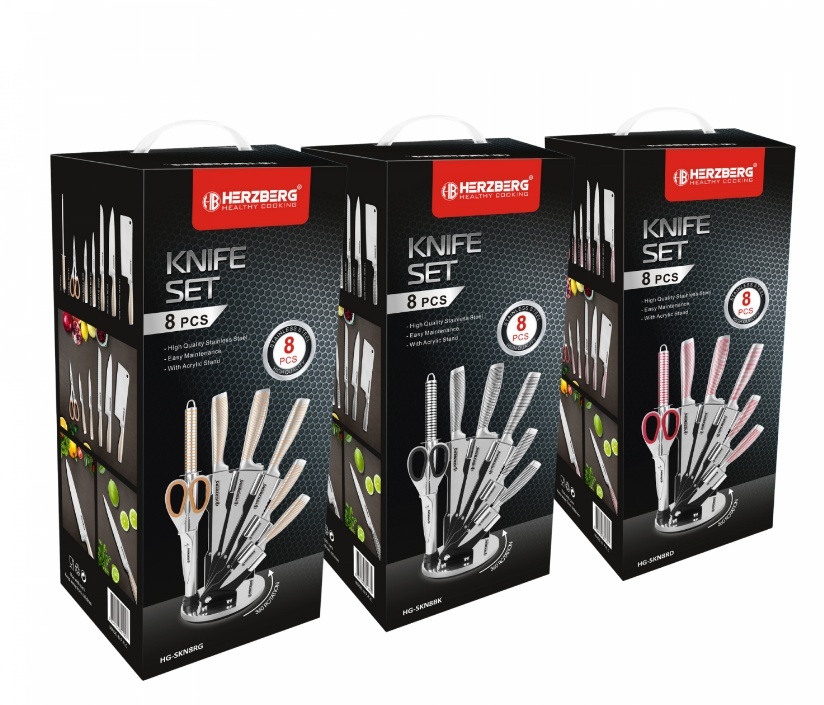 8 daļu visaptverošs nažu komplekts – Šajā komplektā ir viss nepieciešamais virtuvei: smalcināšanas nazis, šefpavāra nazis, maizes nazis, universālais nazis, mizošanas nazis, virtuves šķēres, asināšanas tērauds un stilīgs akrila statīvs. Tas nodrošina daudzpusību griešanas, kapāšanas, šķēlēšanas un asināšanas darbos, padarot to ideāli piemērotu gan profesionāliem pavāriem, gan mājas pavāriem.