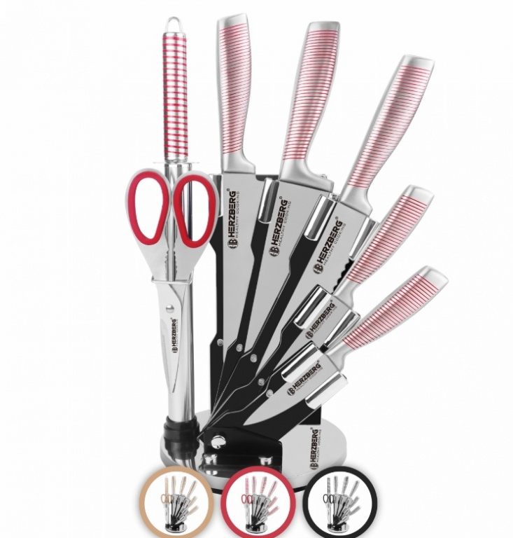 Naži ir izstrādāti, domājot par lietotāju, un tiem ir ergonomiski, neslīdoši rokturi, kas nodrošina maksimālu komfortu un kontroli, samazinot roku nogurumu pat ilgstošas lietošanas laikā. Daudzpusīgajā komplektā ietilpst arī virtuves šķēres papildu funkcionalitātei un asināšanas tērauds, lai saglabātu asmeņu asumu, nodrošinot, ka katrs griezums ir precīzs. Pieejams eleganti melnā vai spilgti sarkanā krāsā, nažu komplekts ne tikai izcili kalpo, bet arī piešķir jūsu virtuves interjeram eleganci ar savu moderno, pulēto dizainu.