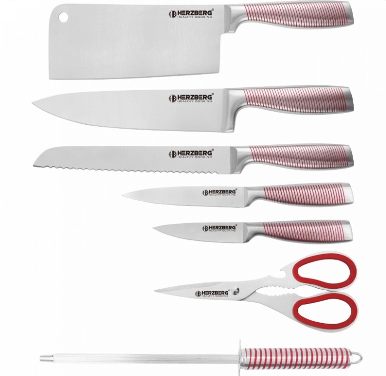 Herzberg HG-SKN8 8 daļu nerūsējošā tērauda nažu komplekts ir būtisks papildinājums jebkurai modernai virtuvei, piedāvājot plašu augstas kvalitātes nažu izvēli, lai veiktu plašu ēdiena gatavošanas uzdevumu klāstu. Šajā komplektā ietilpst 17,5 cm smalcināšanas nazis, 20 cm šefpavāra nazis, 20 cm maizes nazis, 12,5 cm universālais nazis, 9 cm mizošanas nazis, kā arī virtuves šķēres, asināšanas tērauds un elegants akrila statīvs ērtai organizēšanai. Katrs asmens ir izgatavots no izturīga nerūsējošā tērauda, nodrošinot ilgstošu asumu un izturību pret koroziju, nodrošinot vieglu griešanu, kapāšanu un sagriešanu kubiņos gadiem ilgi.