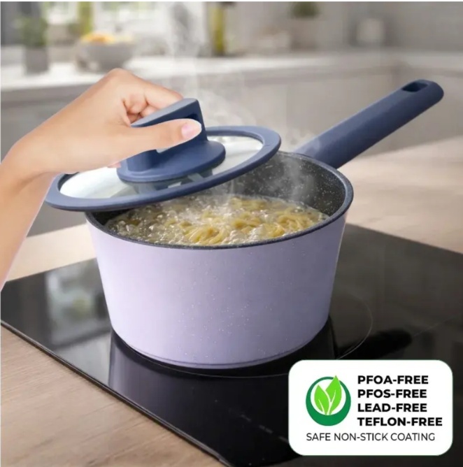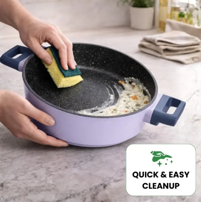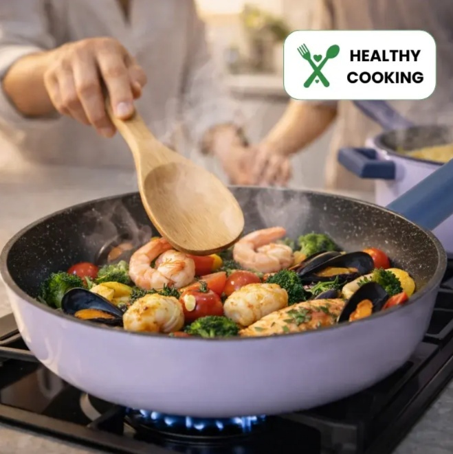 Marmora pārklājums ar nepiedegošu pārklājumu – gludais marmora pārklājums nodrošina vieglu ēdiena atdalīšanu un samazina nepieciešamību pēc liekas eļļas gatavošanas laikā. Tas arī palīdz novērst pielipšanu un paātrina tīrīšanu pēc ikdienas lietošanas.