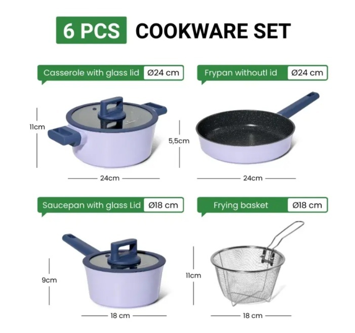 Just Perfecto 4 daļu marmora virtuves piederumu komplekts - zils ir moderns, vietu taupošs virtuves piederumu risinājums, kas paredzēts ikdienas lietošanai un lielam pieprasījumam mazumtirdzniecībā. Šajā komplektā ietilpst 24 cm sautēšanas katls ar gumijas vāku, 24 cm cepšanas panna, 18 cm katliņš ar gumijas vāku un 18 cm cepšanas grozs, kas vienā saskaņotā iepakojumā aptver galvenās vārīšanas, lēnas sautēšanas, cepšanas un notecināšanas vajadzības. Katrs katls ir paredzēts uzticamai ikdienas lietošanai, un tam ir izturīgs alumīnija korpuss ar marmora pārklājumu un nepiedegošu iekšpusi, kas nodrošina vienmērīgu gatavošanu, vieglāku tīrīšanu un ēdienu gatavošanu ar zemu eļļas patēriņu. Komplektam ir eleganta zila apdare, un tas nodrošina augstākās kvalitātes plauktu izskatu, kas lieliski iederas mūsdienu Eiropas virtuves tendencēs.