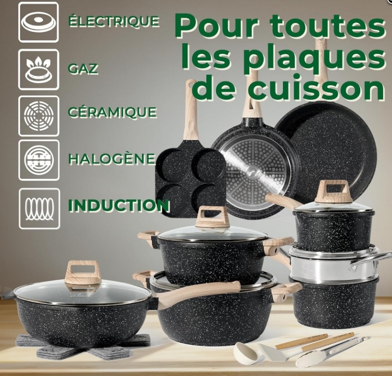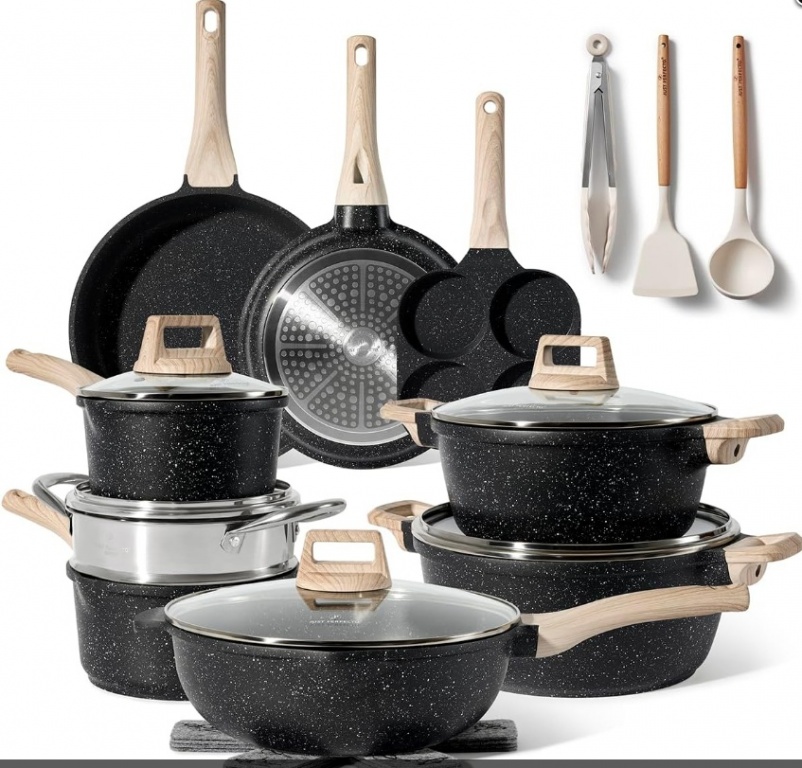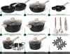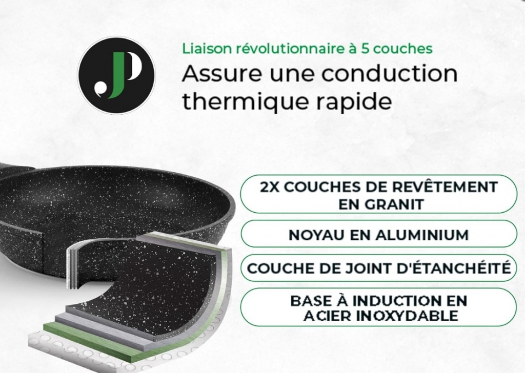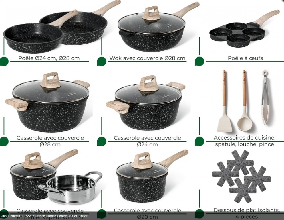 Just Perfecto JL-29 21 daļas granīta virtuves piederumu komplekts ir pilnvērtīgs virtuves risinājums, kas radīts mūsdienīgām mājsaimniecībām un profesionāliem pavāriem. Izgatavots no izturīga alumīnija ar 5x īpaši nepiedegošu granīta pārklājumu, tas garantē izcilu siltuma sadali, vieglu tīrīšanu un izturīgu veiktspēju daudzu gadu ikdienas lietošanai. Gludā melnā granīta tekstūra apvienojumā ar ergonomiskiem koka imitācijas rokturiem piešķir jebkurai virtuves iekārtai greznu un dabisku pieskārienu.