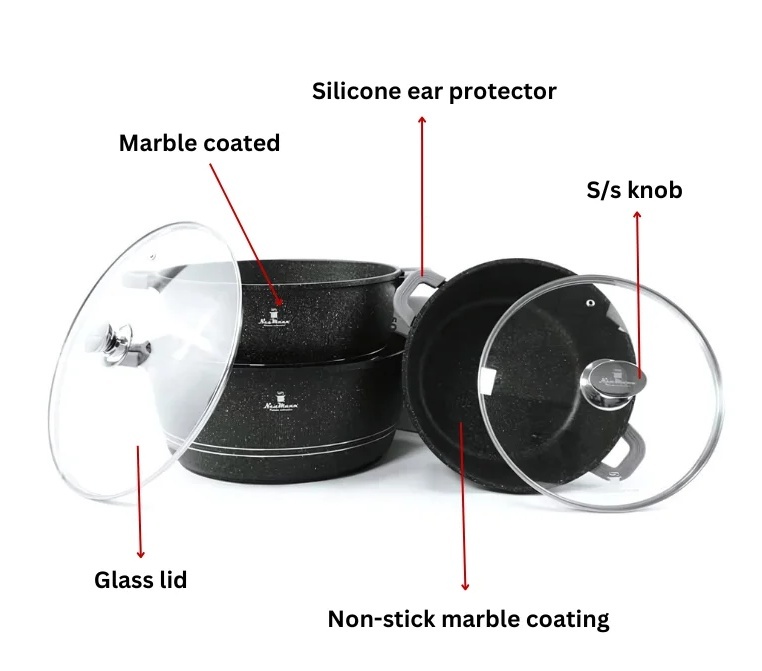 Nepiedegošs Greblon pārklājums — katram katlam ir Greblon C2 marmora pārklājums, vācu tehnoloģija, kas pazīstama ar savu izcilo nepiedegošo sniegumu. Šis pārklājums novērš ēdiena pielipšanu pie virsmas, ļaujot gatavot ar minimālu eļļas patēriņu veselīgākām maltītēm, un padara tīrīšanu ātru un bez problēmām.