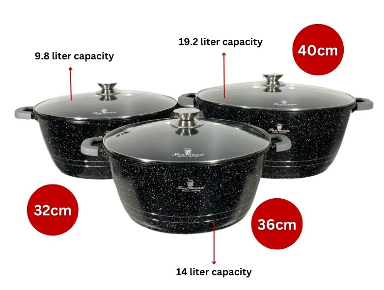 Trīs daudzpusīgi izmēri – Komplektā ietilpst trīs dažādi katlu izmēri: 32 cm (9,8 l), 36 cm (14 l) un 40 cm (19,2 l). Šī dažādība sniedz jums iespēju pagatavot ēdienus dažādās porcijās, neatkarīgi no tā, vai gatavojat ātras ģimenes vakariņas vai lielu mielastu pulcēšanās reizēm, nodrošinot, ka jums vienmēr ir pareizais izmērs katram gadījumam.