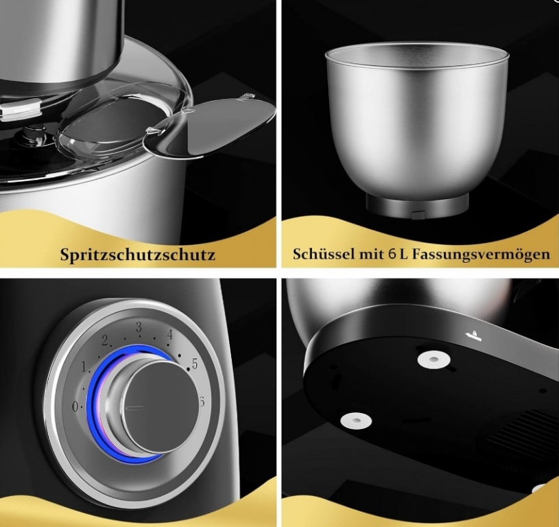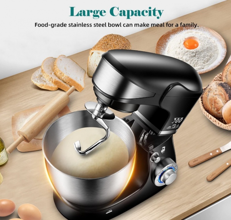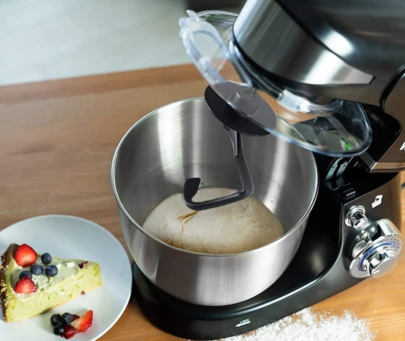 Liela 6 litru nerūsējošā tērauda maisīšanas bļoda – Ietilpīgā 6 litru bļoda nodrošina pietiekamu ietilpību lielu porciju gatavošanai, padarot to ideāli piemērotu mīklas gatavošanai vairākām maizes klaipām, lielām kūkas mīklām vai putukrējuma pagatavošanai desertiem. Nerūsējošā tērauda konstrukcija ir izturīga, higiēniska un noturīga pret traipiem vai smakām.