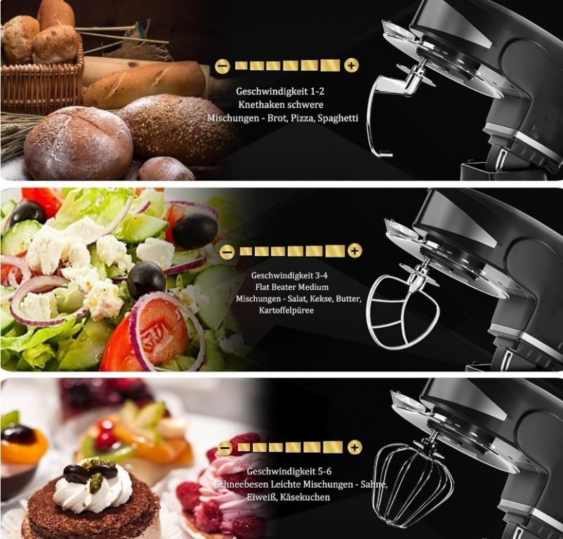 6 ātrumu iestatījumi ar impulsa funkciju – Ar sešiem regulējamiem ātruma iestatījumiem šis stacionārais mikseris ļauj pielāgot ātrumu atbilstoši dažādām receptēm. Impulsa funkcija piedāvā īsus augstas jaudas impulsus, kas ir ideāli piemēroti smalku sastāvdaļu, piemēram, miltu, pievienošanai vai vieglu krēmu sajaukšanai bez pārapstrādes.