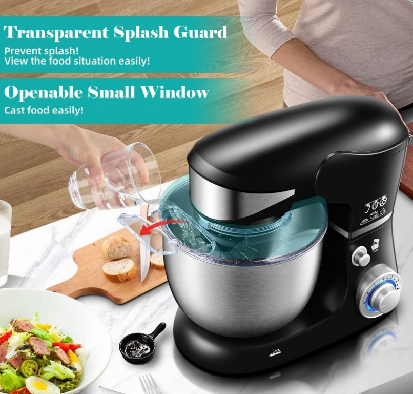 Šļakatu aizsargs ar padeves snīpi – Caurspīdīgais šļakatu aizsargs novērš sastāvdaļu šļakstīšanos maisīšanas laikā, tādējādi nodrošinot tīru virtuvi. Iebūvētais padeves snīpis ļauj pakāpeniski pievienot sastāvdaļas, neapturot ierīci.