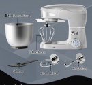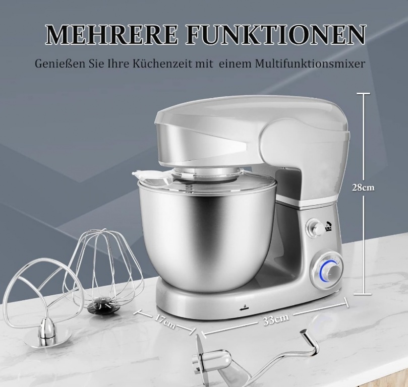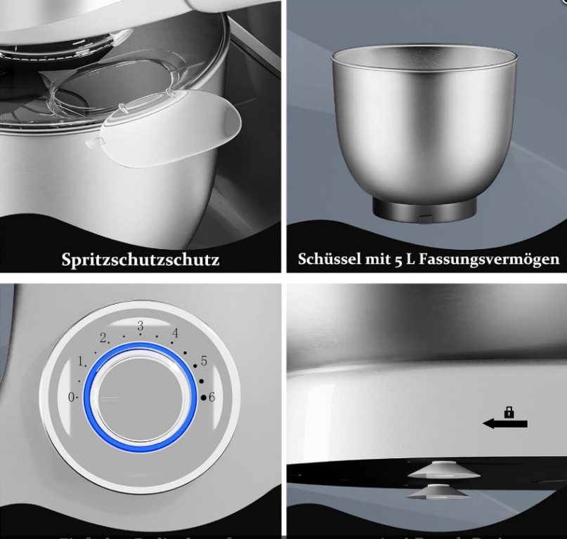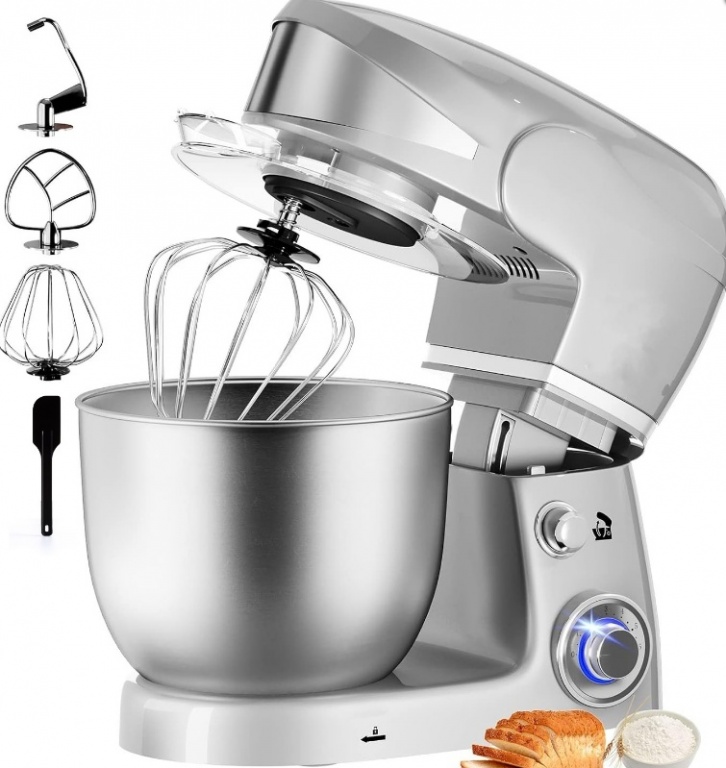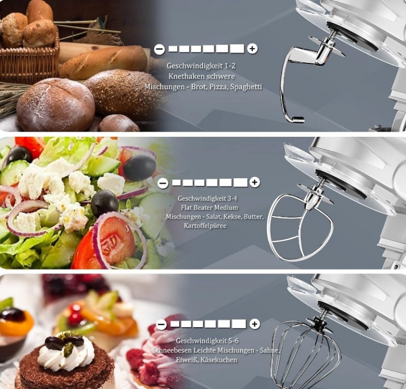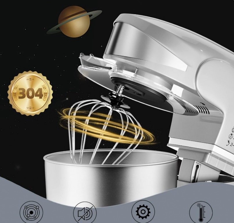 Planetārā maisīšanas darbība – Planetārā maisīšanas kustība nodrošina vienmērīgu sastāvdaļu sadalījumu, rotējot putotājus ap bļodu un vienlaikus tos griežot. Tas novērš nesajauktu sastāvdaļu pielipšanu pie malām, novēršot nepieciešamību pēc manuālas kasīšanas. Iekļauti daudzpusīgi uzgaļi – Šim virtuves kombainam ir mīklas āķis, putotājs, putotājs un skrāpis, kas sniedz vairākas iespējas dažādām gatavošanas vajadzībām. Mīklas āķis ir ideāli piemērots smagu mīklu, piemēram, maizes vai picas, mīcīšanai, putotājs ir ideāli piemērots krējuma vai olu baltumu putošanai, un putotājs nodrošina vienmērīgu mīklas un mērču sajaukšanu.