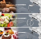 6 ātrumu iestatījumi ar impulsa funkciju – Ar sešiem regulējamiem ātruma iestatījumiem šis stacionārais mikseris ļauj pielāgot ātrumu atbilstoši dažādām receptēm. Impulsa funkcija piedāvā īsus augstas jaudas impulsus, kas ir ideāli piemēroti smalku sastāvdaļu, piemēram, miltu, pievienošanai vai vieglu krēmu sajaukšanai bez pārapstrādes.